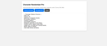 Character Randomizer Pro es una herramienta 100% de texto que genera descripciones completas de personajes con un solo clic.