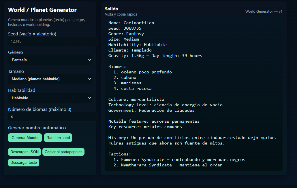 World / Planet Text Generator es una herramienta diseñada para creadores que necesitan inspiración rápida en formato 100% textual. No genera mapas ni gráficos: genera información escrita, detallada y utilizable en cualquier proyecto creativo.